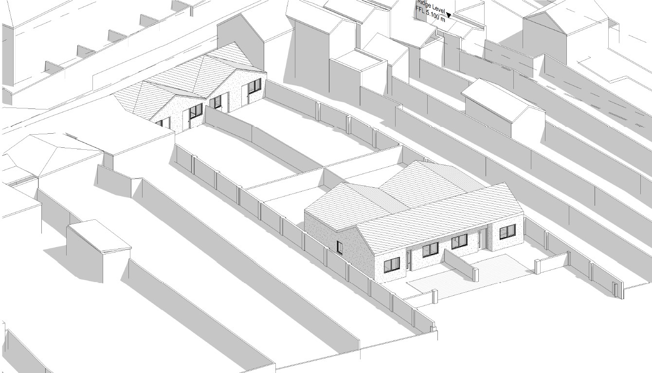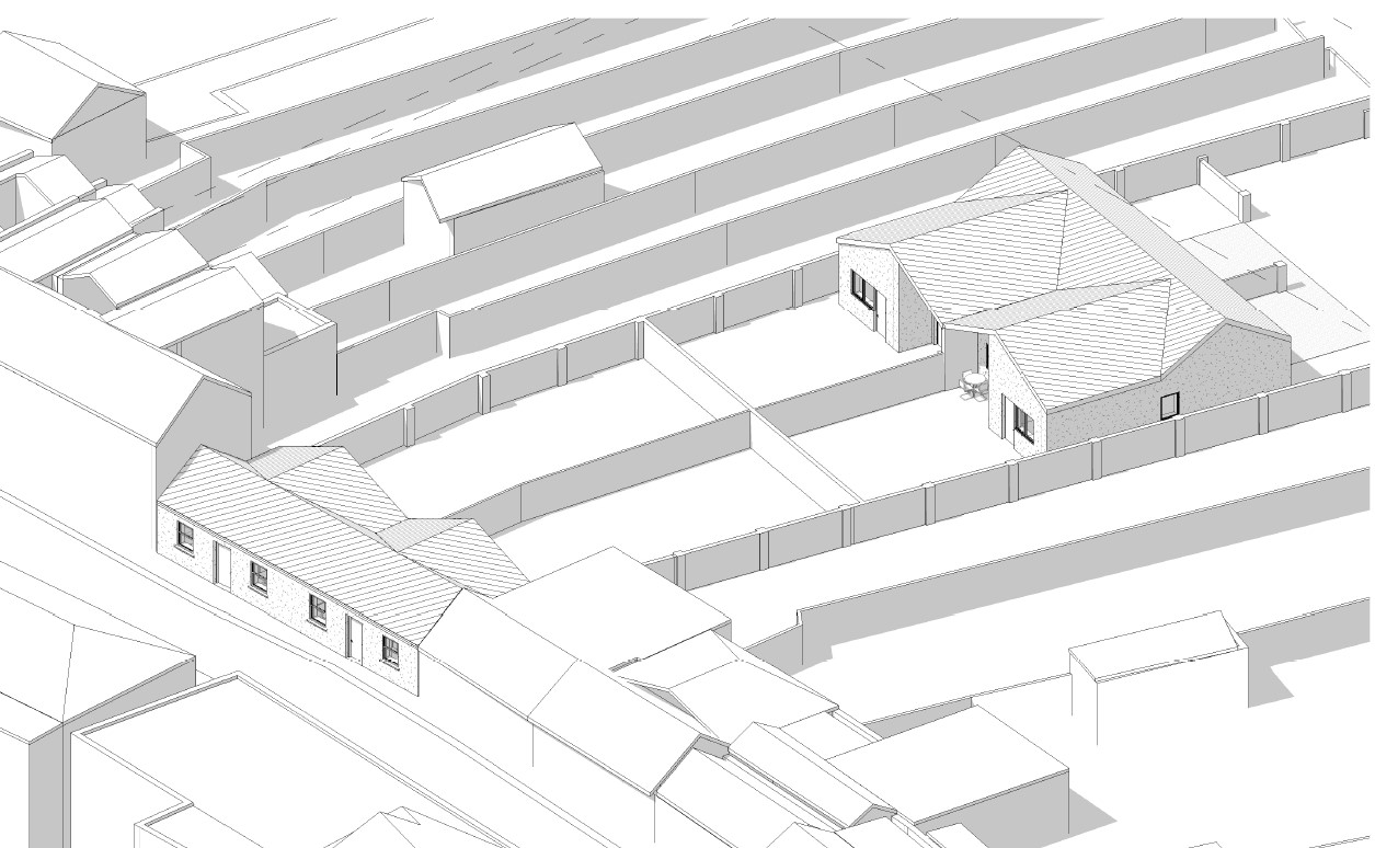 • Construction of 4 no. single storey houses comprising - 2 no. 1-bed single storey replacement terrace dwellings (fronting onto Haggard Street); and 2 no. 2-bed single storey semi-detached infill houses accessible from the existing rear lane.